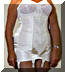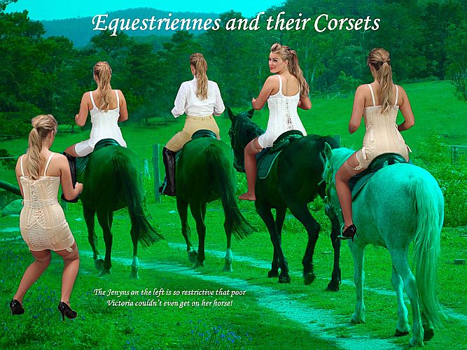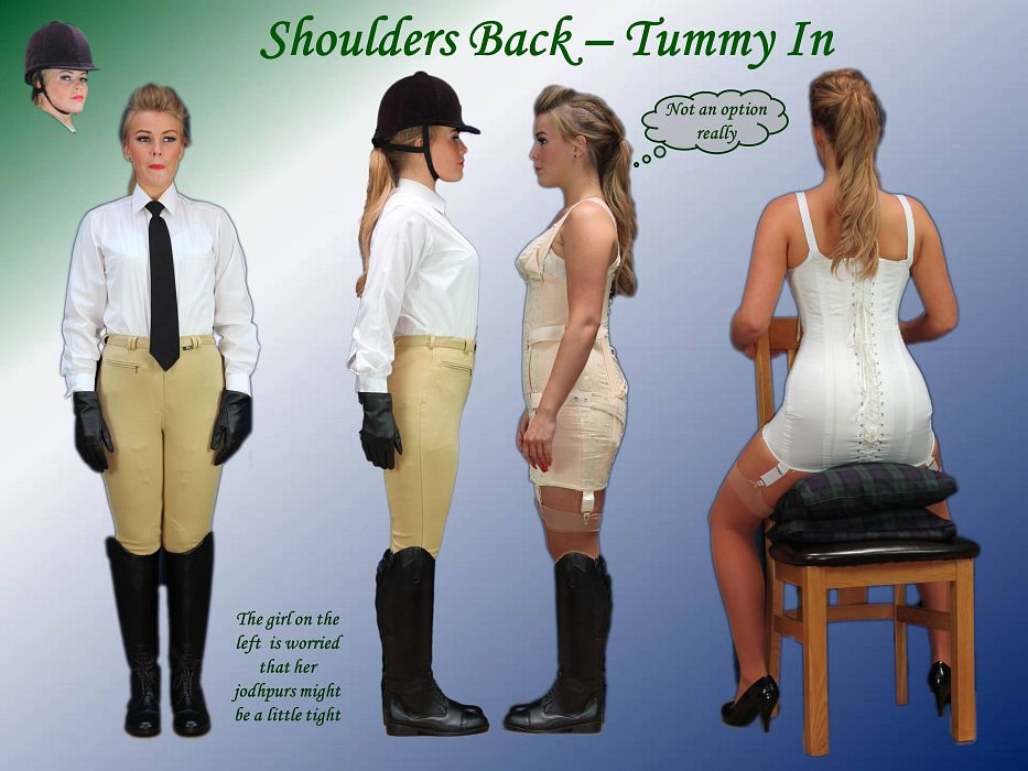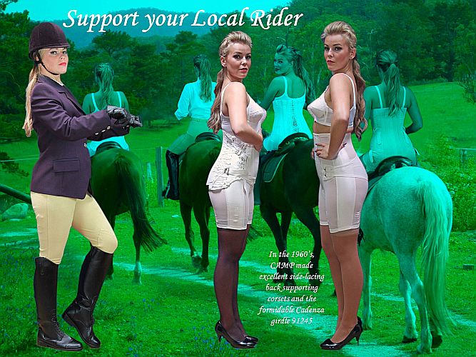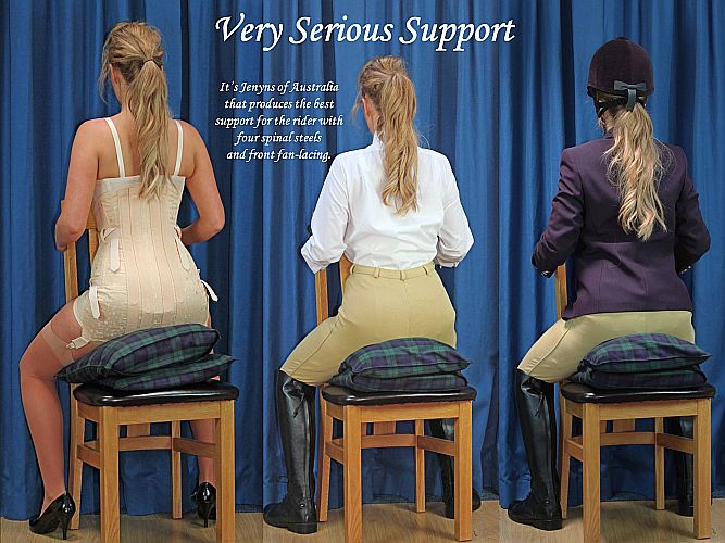 The Equestrienne's Support There are many activities that can take a toll on a wearer's back and horse riding is one of them. Even the act of horse riding can put a strain on the back without even having to fall off the animal. Indeed, a good support can have the double benefit of protecting the back and improving one's posture. If your back is already weak, a firm corset can make all the difference between a pleasant hack in the country and a painfully disagreeable experience often followed by a day recovering in bed. We have used our model Victoria to demonstrate some of the supports available, however, be warned, the rigid spinal steels and even the colour of the corset itself will reveal your secret to anybody with a keen pair of eyes. (Victoria wears a Jenyns lumbo-sacral support - right). The classic white shirt worn by the equestrienne is not the camouflage that you might imagine. The following account illustrates this point: