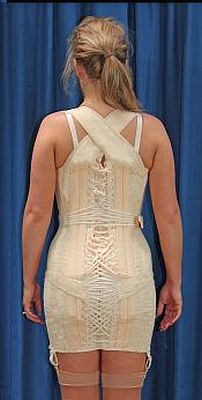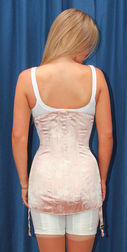 On the left is a Camp 9974. The four sets of lacing seem something of an overkill until you realise that this support was designed for maternity wear; the two forward sets of lacers for periodic adjustment and the side fan-lacers to tighten the garment. A quirk of Camp measurements is that their conventional girdles and corsets were sized by the waist, whereas, the back supports were sized by the hips. Victoria wears a size 34 here that perfectly fits her 27 inch waist. Next is a Canadian Spencer. It is obvious that the corset has been cut with a scanter hip-spring than Victoria would like. We strongly suspect that this was an elderly woman's corset since women tend to lose the flesh over the buttocks in later life. The woman certainly had a bad back since this corset has four rigid spinal steels and is one of the heaviest corsets in our collection weighing in at 800 grams (nearly two pounds). The Jenyns dorsal-lumbar support also has four rigid spinal steels and is a far better fit on our model and certainly shows off the curve of her back; indeed, she had little option. On the right is a trusty British Spirella 325 (the front and back-lacing model version of the 305). Again, it fits Victoria very well and puts an admirable waist upon her. It is far lighter than the previous two corsets but would fail to protect the back since, although it is well boned, there are no rigid steels. One of the firmest corsets that Victoria tried was the pink creation below. This is a very serious corset and the absence of any maker's name suggests a made-to-measure item probably from Germany. The only way to enter the corset is to loosen the laces and step in. The lacing that caused Victoria some trouble (below left) is then tightened and six very wide and long pre-formed rigid steels then grip the wearer at the back, sides and front rendering the lower spine quite immobile.