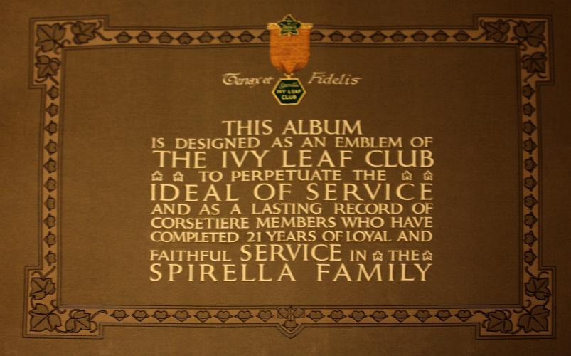 Spirella was one of many corset companies that flourished during the twentieth century. I am fortunate to know a small part of their history in Britain and I would like to share that history with you because I find it fascinating and I regret its passing. Spirella corsetieres could join the Ivy Leaf Club. Emblems were issued and corsetieres could collect pins for each decade of selling. Spirella was bought by rival Spencer in the late 1980's (in Britain) although the name survives today as does the magnificent head office in Letchworth where a staff of hundreds manufactured made-to-measure corsets for eight decades.