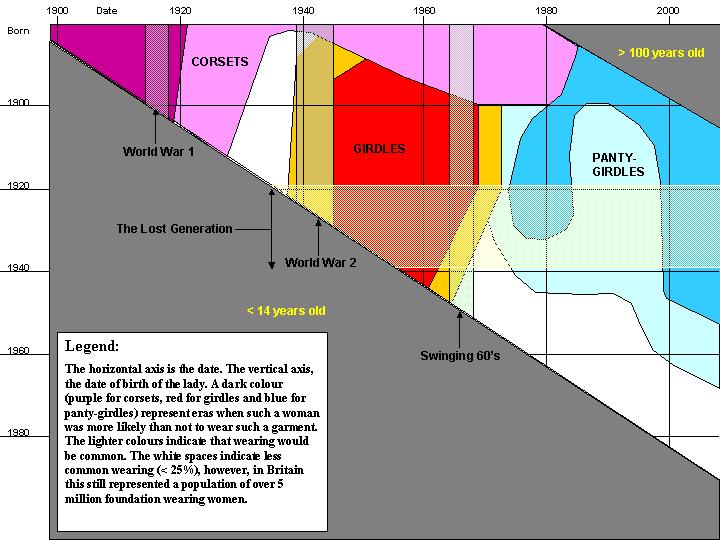 5) Ivy's 'Lost Generation', is represented by the horizontal yellow band, i.e. those women who are currently aged 65 to 85 years old. Certainly, they were regular girdle-wearers, however, you have to go back another 20 years to catch the corset-wearing Edwardians. That's why genuine recollections are usually the preserve of the very elderly.