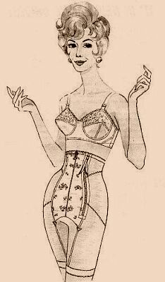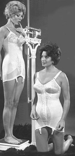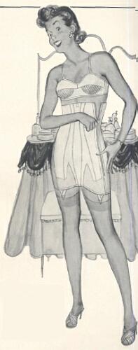 Girdles arise and fall over a three decade period, the shortest of any serious foundation garment. What might have been a longer success was squashed in short order by the panty-girdle. This garment first appears pre-WWII but dramatically dominates the catalogues as the 1950's come to an end having evolved into the long-leg panty-girdle. For two decades, American women wore a bra and panty-girdle; it might as well have been a uniform (right). Incidentally, Sears never used the term panty-girdle, simply panty or girdle.