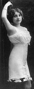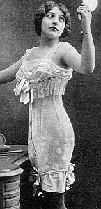 Rose Dewitt Bukator (left) displays a typical Edwardian corset, although oddly with no suspenders. It is a very long garment, but the horizontal creases show where she has sat down. The busk length has to be carefully designed so as not to injure the wearer! |