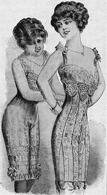 This section might almost be called the rise and fall of tall corsetry. A century ago, as these photographs show, corsets could be very long indeed. Above the waist, one wonders if the wearer could even bend, and below the waist, some corset skirts were so extreme that sitting down was surely a major problem. This is strongly exaggerated in the French advertisement (far left).