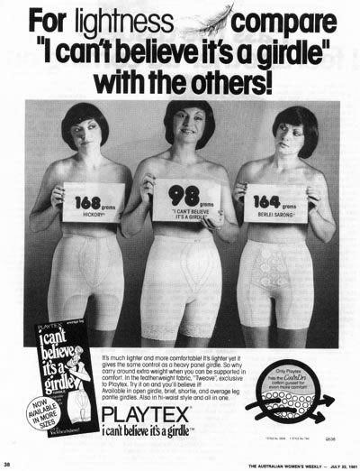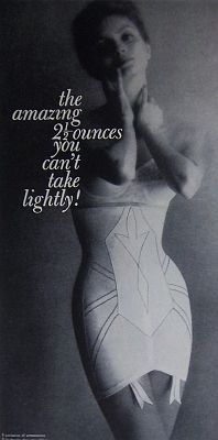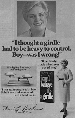 Such weighty foundations have all but disappeared, indeed, from the 1960s onwards, the thrust was towards lightness and comfort. I have no objection to comfort at all, however, a foundation is a foundation and should do its job. Did the Playtex girdle at 98 grams (right) really have any effect at all? Certainly not on the slim model in the advertisement! The 2½ oz (73 gr) full girdle by Warners is even lighter, including four suspenders. I have come across such light girdles, Miss Mary of Sweden's are surprisingly light, but there is no substitute for weight.