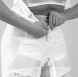 .... then turn the garment inside out and upside down; pull the inverted girdle up your legs; now pull it outside in and walk the girdle up your legs....