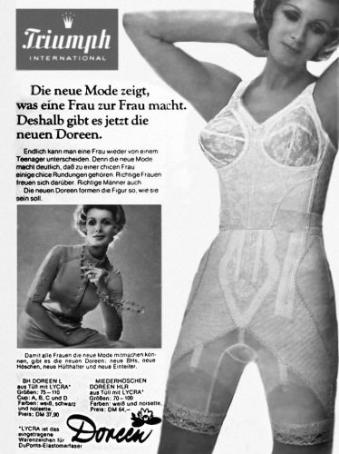 Triumph of Germany (left) advertises its famous foundation garment range, the 'Triumph Doreen'. Yet the advertisement seems to enhance the appearance of 'structured foundations' and does Susa. Was there any quick way to get out of these contraptions?