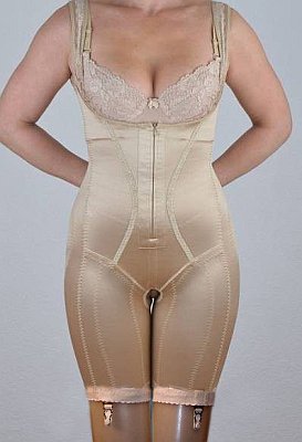 Firstly, the garment is turned inside out and pulled up the legs. The garment is inverted and the wearer walks her way into the girdle. The shoulder straps then hoist the back into place. The hooks-and-eyes are forced to meet (if you have any strength left by this stage) and then the device is zipped up. I apologise for any levity here but it is quite a process; mind you, the results are very effective as many latinas and American women can endorse. Would that more women realised the benefit of a true foundation.