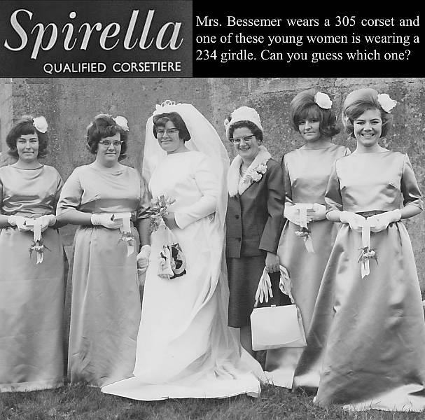 There are eighteen ladies present, who ages range from 24 to 70. This means that some of the older ladies were born around the turn of the century, whilst the brides and bridesmaids would have been born at the end of the Second World War. Ten are wearing corsets, seven are wearing open-bottom girdles and one daring young thing is wearing the new-fangled (in Britain anyway) pantie-girdle. How good a corsetiere are you? Click here to go to the articles as they appeared in the Spirella Magazines from 1960 to 1969. We have chosen this period because it represents a period of social upheaval that started off with the demise of daughters being carbon copies of their mothers and ended with the demise of lower foundation garments in general. The preponderance of corsets is not typical of the era but might have been typical for a wedding party. Bear in mind, Spirella had a vested interest in promoting structured underwear.