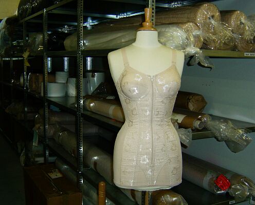 Patterns hang on the wall (above). These are so important to a corset maker. When Spencer (amazingly) lost their brassiere patterns a few years ago, they simply had to give up making brassieres! The cutters select the pattern appropriate to the customer's requirements and layers of fabric are cut with machine scissors. Multiple fabric layers are a feature of Figesta's products, providing strength and warmth in the right places with a degree of flexibility in others. Corselettes abound (for model 100 is their best seller) both under construction, and garments returned for modification or simply copying. Figesta offer a variety of bespoke services.