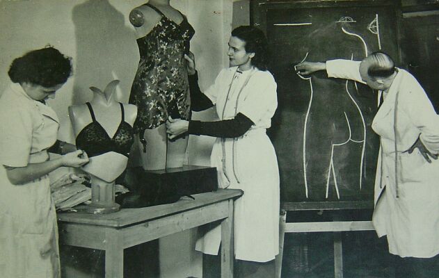Let's be grateful that, although Figesta barely boasts a dozen staff with two cutters and two sewers, at least they still exist. Fitters like Frau Schäfer still possess the skill and patience to produce a corset designed uniquely for its wearer. The previous Chief Fitter, who worked for the firm for 40 years, still stands in occasionally when demand warrants her presence. The picture below takes the fancy of everybody who sees it. It speaks of a bygone age, a busier corsetry trade and gorgeous fabrics. Unfortunately, the photographer caught the gentleman with the chalk at an inappropriate moment! The gentleman is in evidence in all the other old photographs for he was the cutting and sewing supervisor, so frequently a male job until female liberation.