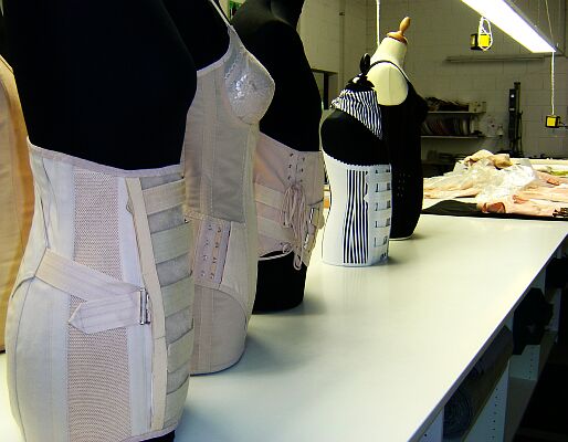 Such is the modern world of corsetry, that virtually all clients now order their supports via a doctor in order to claim the costs from their medical insurance. Sadly, this explains the high price of these, albeit high quality, products. Normally the client visits the doctor who passes over a prescription that can be taken to a medical supplies store. A fitter, qualified by Figesta, then measures the client and passes the measurements to Figesta. The article is then cut and constructed but with unfinished seams. The garment passes back to the fitter for final adjustment on the client before being finished, either by the fitter, or back at the Figesta factory. This iterative process is a bit laborious, but it does ensure a fine, tailored fit.