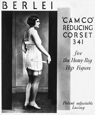 Yes indeed. Corsetting the stout woman is not a subject for levity as this gimlet eyed matron suggests. Nevertheless, the Teutonic cherub in the 'Ski' advert quite seems to enjoy her substantial corsetry, whilst Spirella's 1930's model "thinks of England" and appears resigned to the photographer's attention. On the right, we have a picture that amply portrays the words of Mary Armstrong, chief corsetiere for Ambrose Wilson in the 1970's, "Let's not romance about corsetry!" Rite-Form really take advertising to its limits. That corselette is designed for the larger woman, but the drawing is of a size 10 model. Did they really think that their foundation garments were that effective? Berlei got back to basics, and in typically Australian straight-forward fashion aims its advertising at the 'heavy, big hip figure!' Interestingly, in this pre-war advertisement, the corset is marketed from the Berlei-Camp company, the Camco 341 being none other than a Camp corset made under licence.