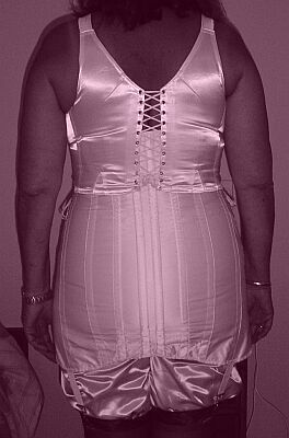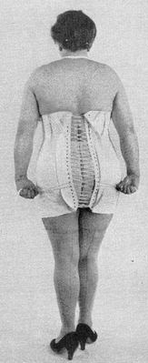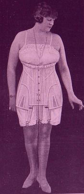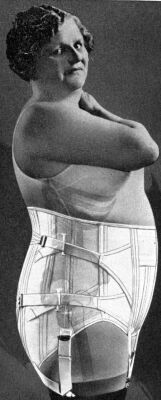 And as for the lady on the right (above); well, I'm sorry my dear, that corset looks fine from the front, but it will never, ever fit. You are pulling the laces from the wrong end, and if you ever get the top of the corset to close within six inches, breathing will, I fear, become impossible. The stout woman should be supported by her corsets; they should give her a feeling of confidence and well-being. Forcing a waist onto a reluctant torso is best left to septuagenarian actresses. An aging and famous actress once appeared at a charity dinner, where she was described by her hostess (out of ear-shot) as a badly-packed satin sausage. I'm sorry, the stout woman can do far better than that!