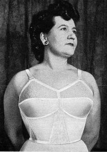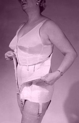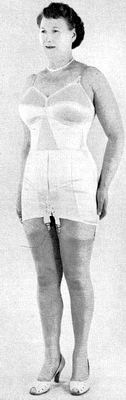 In the 1930's (right) Camp employed its (almost) unique cluster lacing to support the large bosom of the matronly figure. Whether such engineering was absolutely necessary is challenged by Spirella, who's Fashion Line brassiere of 1958 does a similar job without the 'rigging', and, I might add puts quite a waist on this 40-year-old woman.