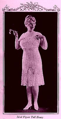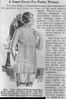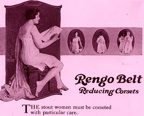 With particular care indeed! "Rengo Belt Reducing Corsets mould the stout woman's figure into the long graceful lines that she has so often admired in other women." The money that could be extracted from the corpulent matron by an experienced corsetiere would certainly provide for the family holiday. In the section on corsetieres, the subtle, and lucrative art of persuading the woman desperate for an improved figure to part with her husband's money is described in detail. Times have changed. The comments above about "the husband's money" are neither chauvinistic nor untrue. It was the way of the times. My husband interjects here and asks if the women concerned had been 'working women', would they have been so casual about spending their money? Interesting male question, but more for a sociologist than a corsetiere. The corsetieres used the attitudes and fancies of their era to do what any businessman or women wants to do; and that is to turn a profit. Perhaps the difference between then and today is that without that profit earned by the woman, the family might have gone to the wall.