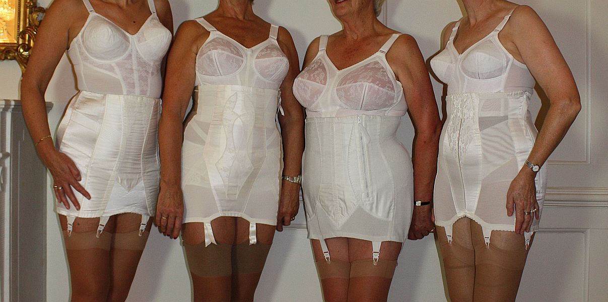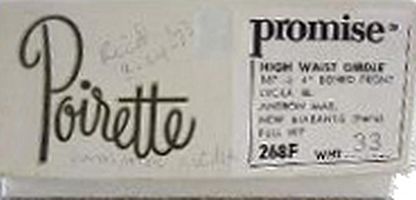 It might seem odd to illustrate a page dedicated to Poirette with four different girdles, but in the 1960s, competition for this garment worn by millions of women was intense. From left to right, Marjorie wears the classic Marks & Spencer satin elastic girdle, Amy wears a Poirette Promise, Madeleine (with some difficulty) squeezes into a later M&S product (hence the more utilitarian design) and Eileen wears a Miss Mary of Sweden. All are very pretty lower foundation garments, even the later M&S offering, but there is a marked difference in weight and denier of the elastic sections. The M&S girdles are heavier and more powerful than the Miss Mary or Poirette, nevertheless, all these girdles work well on the models. At first acquaintance, the Miss Mary and Poirette feel insubstantial but they work. Even Cathie Jung wore a Poirette until she started corsetting. Her very own girdle is shown below.